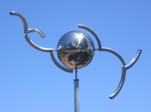 | "WorldWind" This sculpture represents the world's need for alternative energy solutions, in this case wind power, and suggests that traditional windmills could be more artistic in design. It contains 5 pivot points, reflects our environment, and creates graceful patterns as it moves with the wind. It is fabricated out of Aluminum and Stainless Steel. Was on display at 'Sculpture in the Gardens' at San Diego Botanical Gardens - Encinitas, CA |